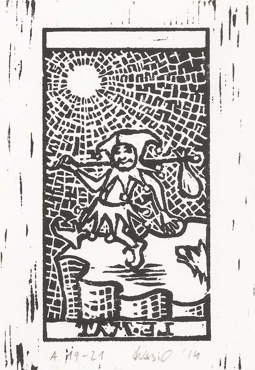 Late 2013 I discovered a long forgotten I have book about tarot. Reading that book I got inspired by the many symbolic images on the cards. These symbolic I could use to express myself in my paintings. Thus I decided to make a series of paintings and block-prints that would be based on the Images of the tarot cards. Through the centuries many versions of tarot decks have been made. For my series I decided to use the Marseilles deck version, because of it's clear line images. It is not my intention to copy these images but to make a variation based on the original images.